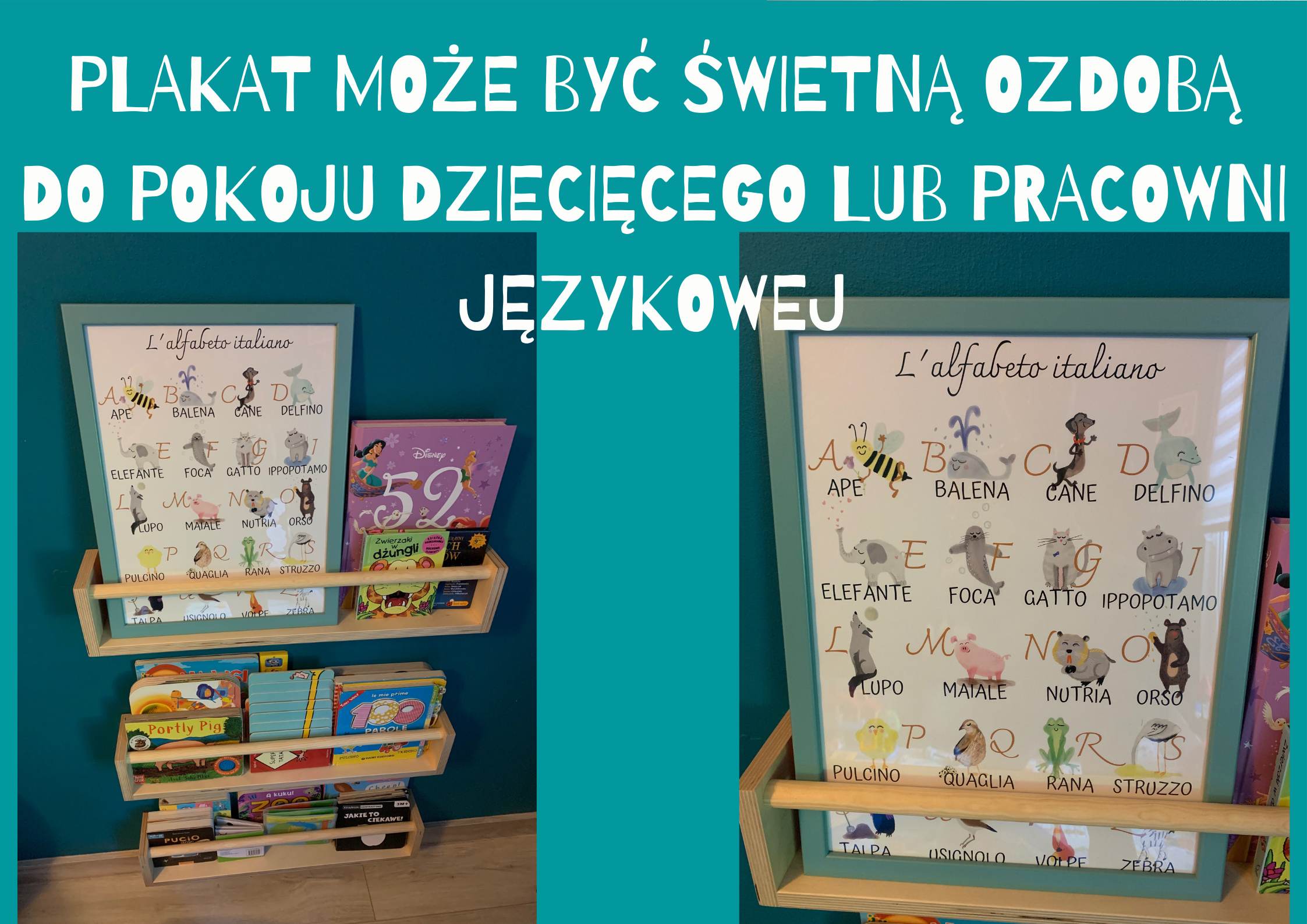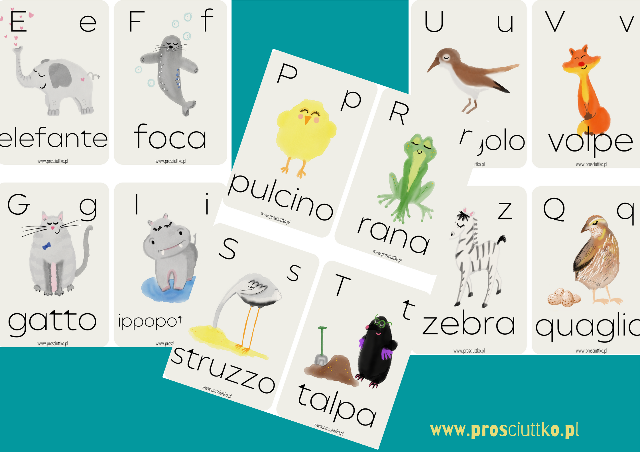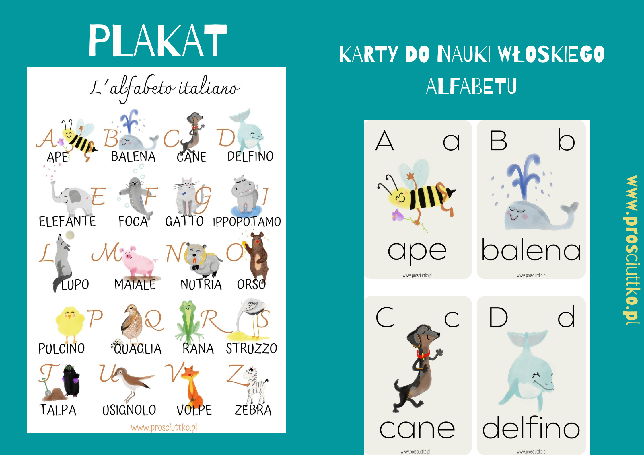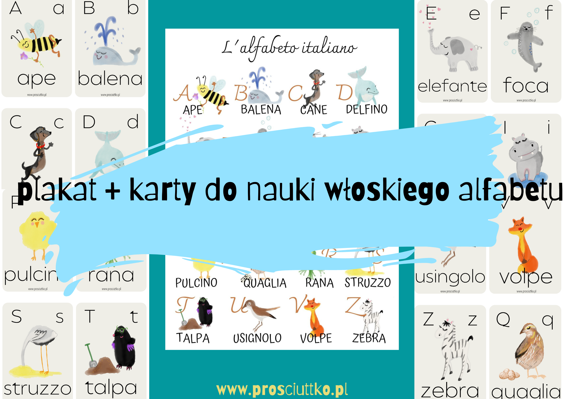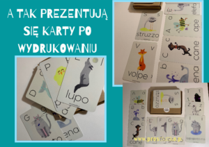 Do zestawu dołączony jest plakat z włoskim alfabetem, przedstawiający te same zwierzęta, które znajdują się na kartach.